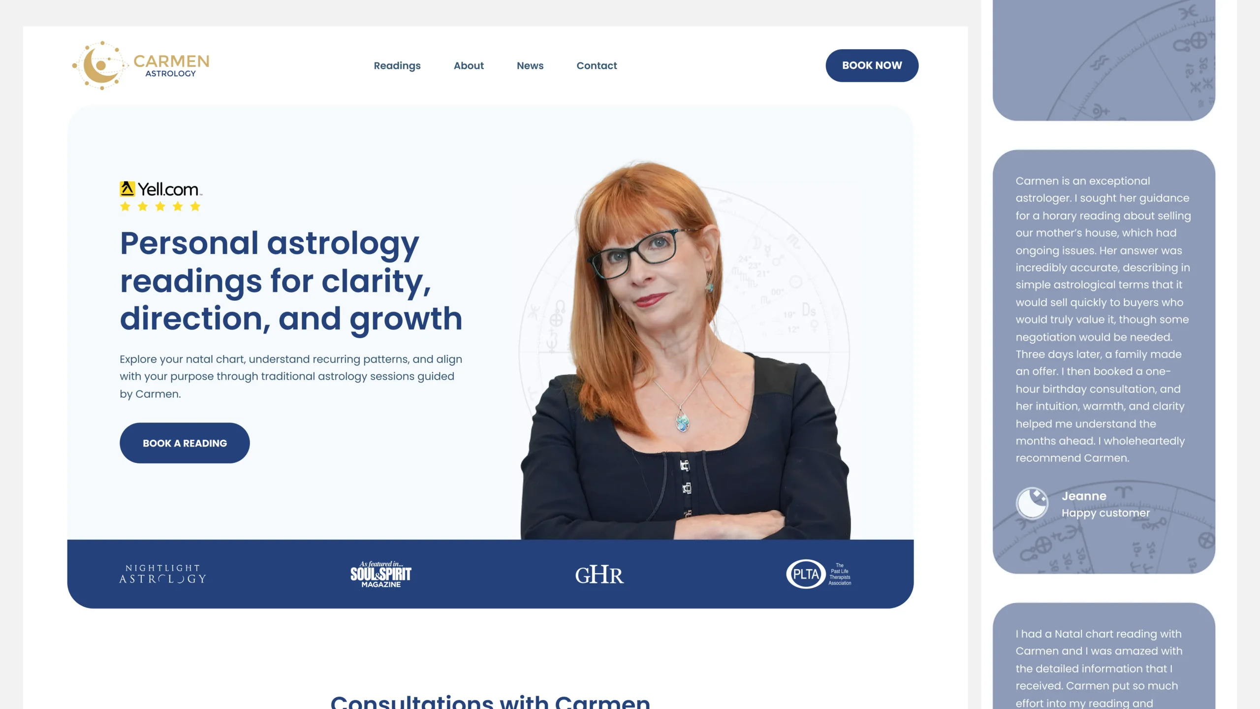 The website design emphasises calmness and clarity, guiding visitors through services and bookings without distraction. Content structure and SEO were implemented to capture searches around natal readings and yearly forecasts.